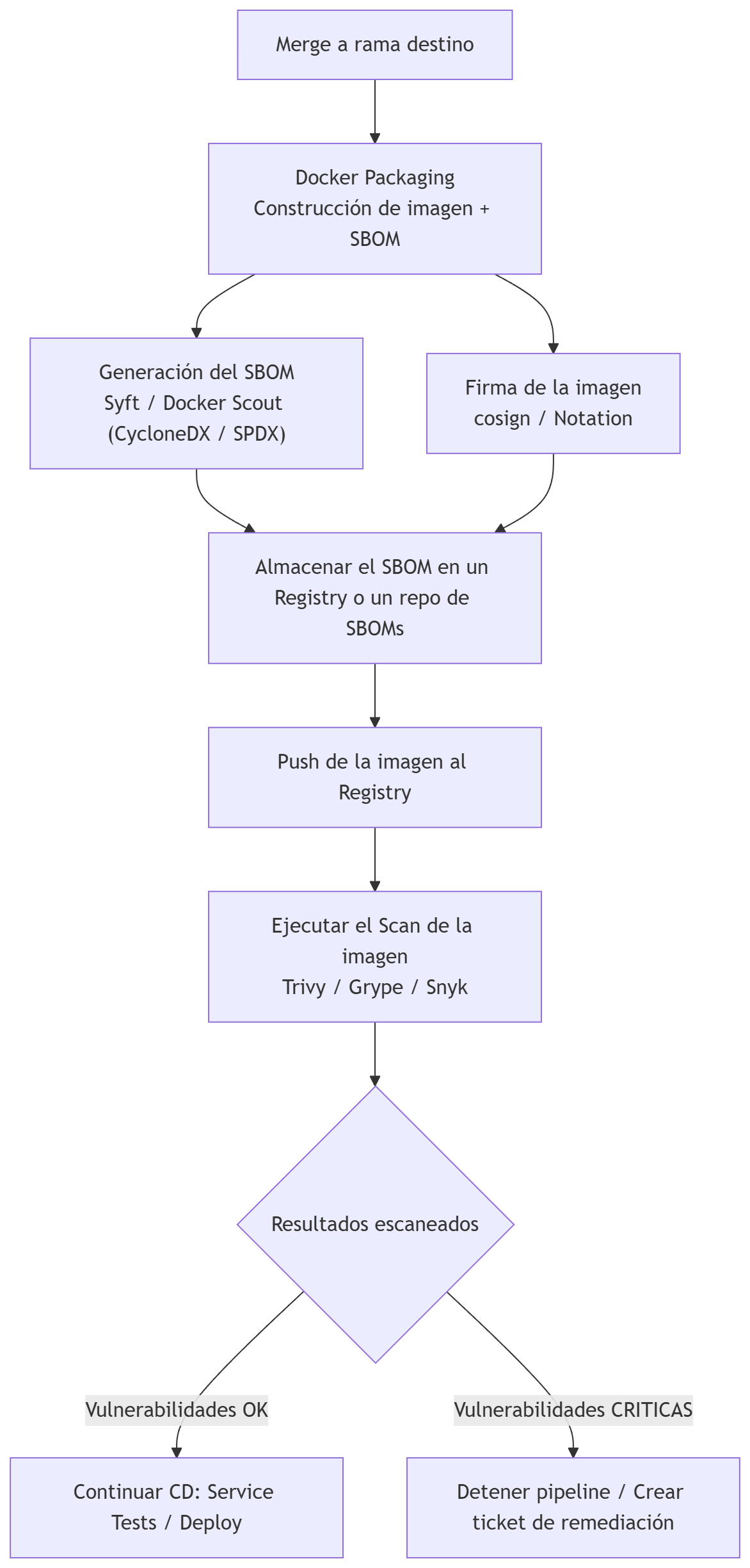 • Genera SBOM en el mismo job que construye la imagen para garantizar consistencia.