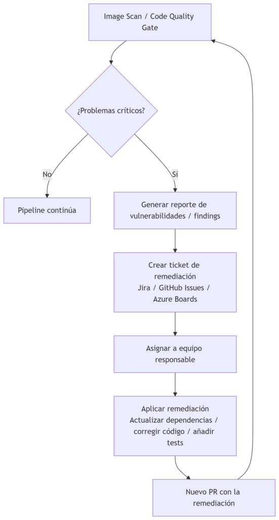 Es el conjunto de acciones necesarias para corregir una vulnerabilidad, fallo de calidad o incumplimiento detectado por el pipeline. Dicho de otra manera: remediar es arreglar lo que rompe algún Quality Gate.