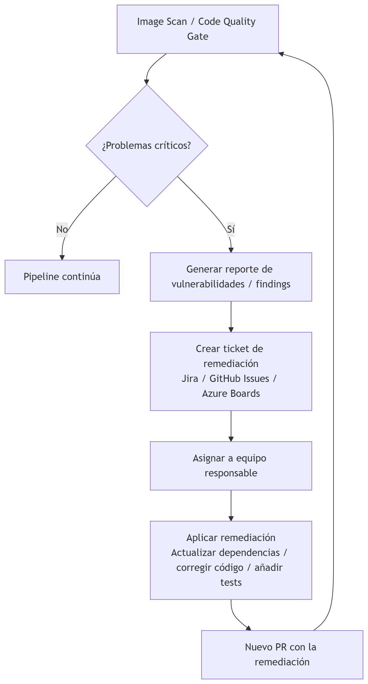 • Automatización de remediación: propuestas de versiones seguras o parches, generación de PRs con cambios en dependencias o Dockerfile.