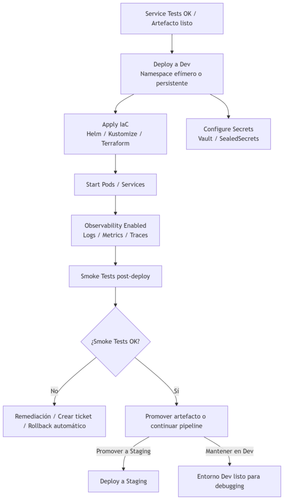 - Provisionar entorno: namespace/cluster efímero o persistente para Dev; aplicar configuración de runtime (config maps, secrets gestionados por vault).