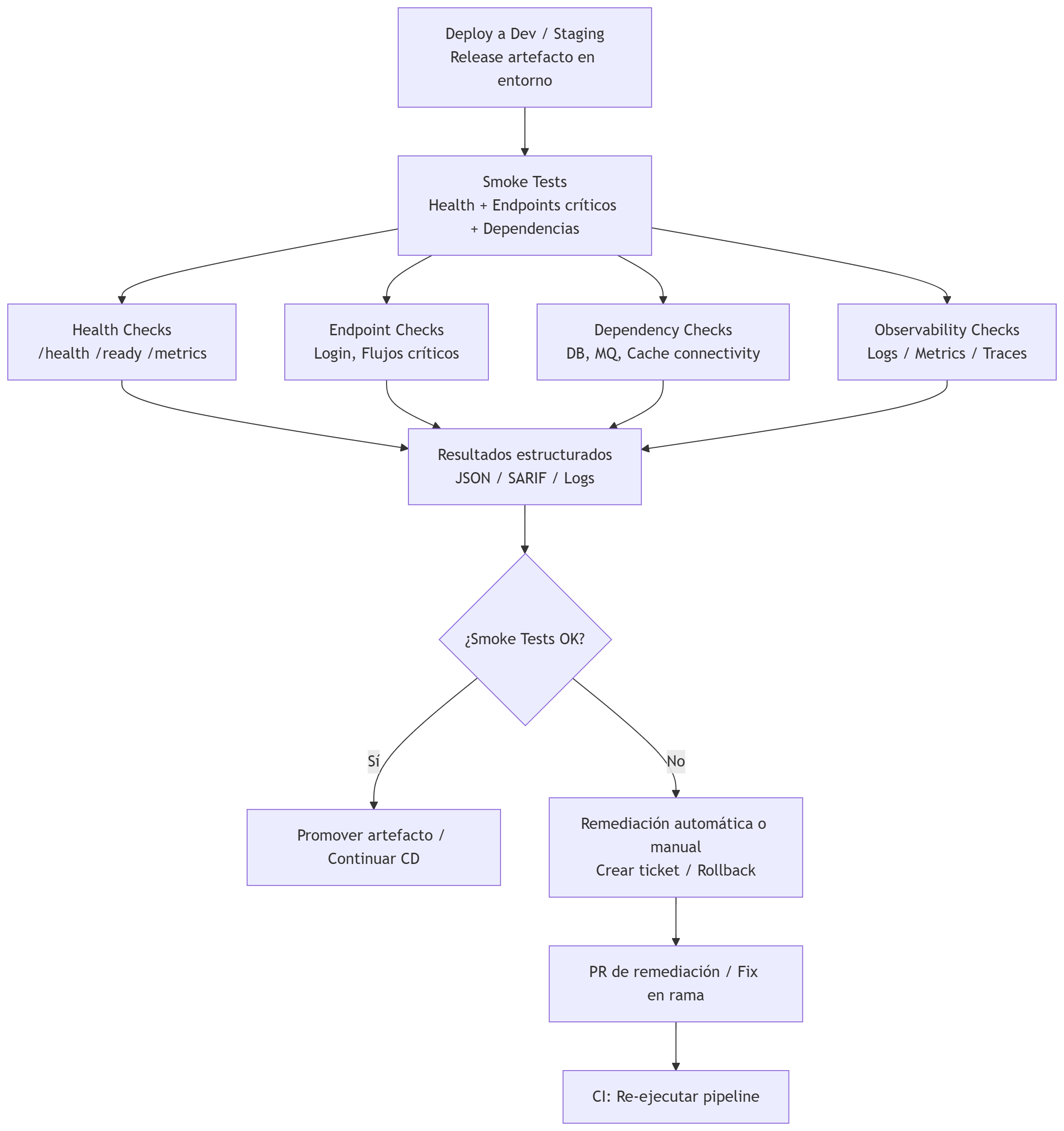 Son comprobaciones rápidas y deterministas que validan la salud y las funciones críticas del servicio tras un despliegue en un entorno (Dev, Staging). Deben ser rápidos, idempotentes y con salida estructurada para integrarse con gates y procesos de remediación.