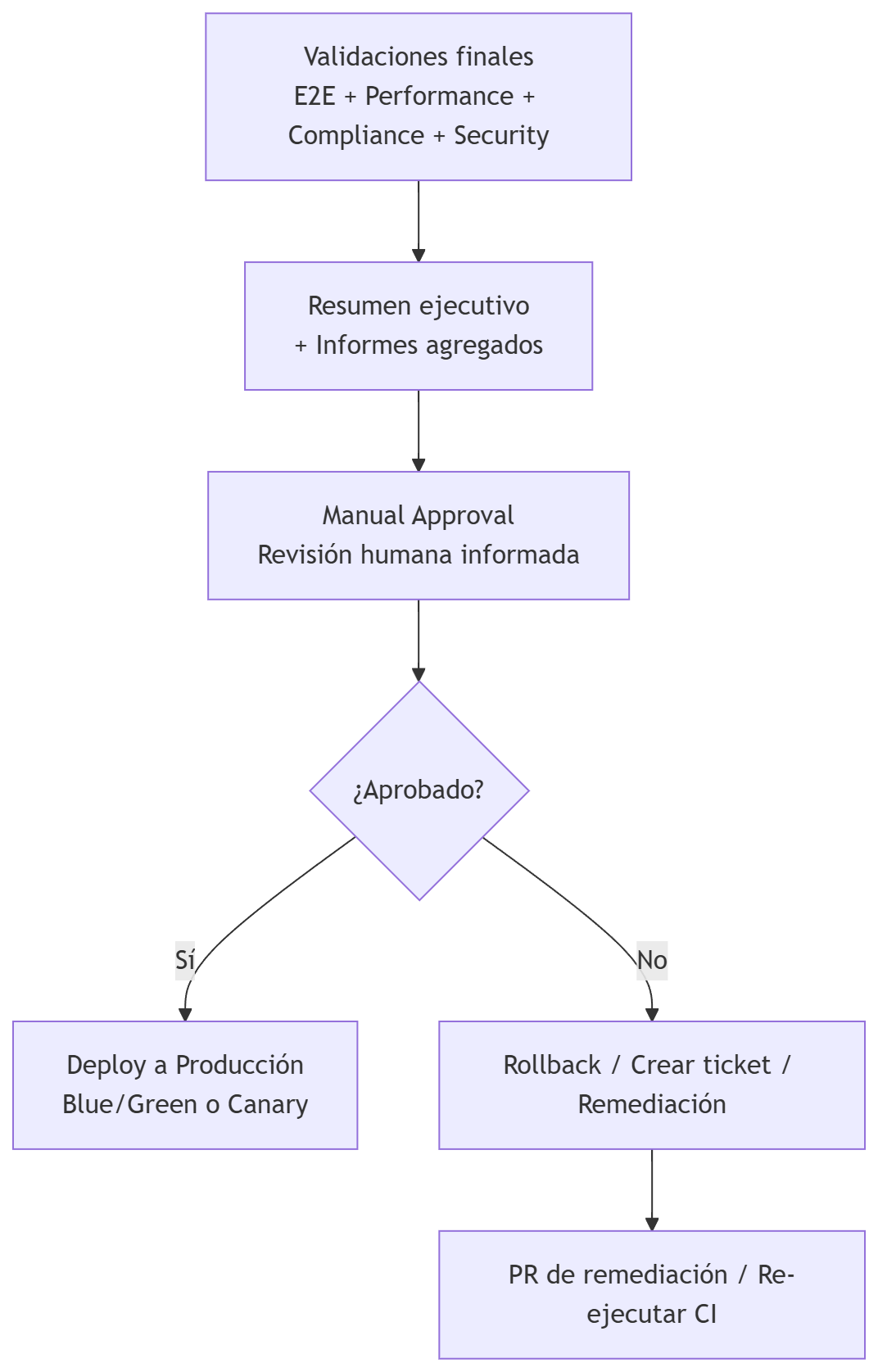 • Validación contextual: el pipeline no conoce prioridades de negocio, riesgos reputacionales ni dependencias externas. El aprobador sí.