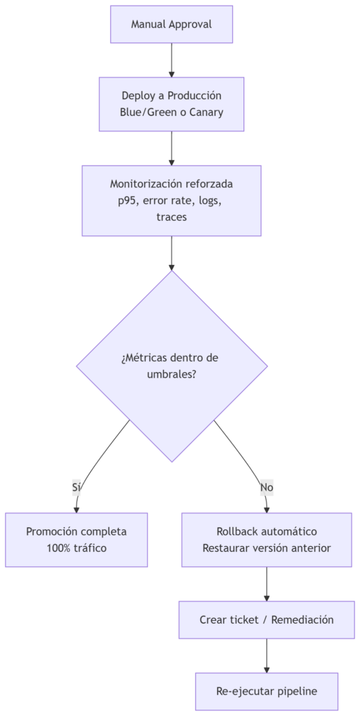 • Observabilidad reforzada: durante el despliegue se monitoriza p50/p95/p99, error rate, saturación CPU/memoria, latencia DB, logs anómalos, trazas distribuidas e impacto en usuarios reales.