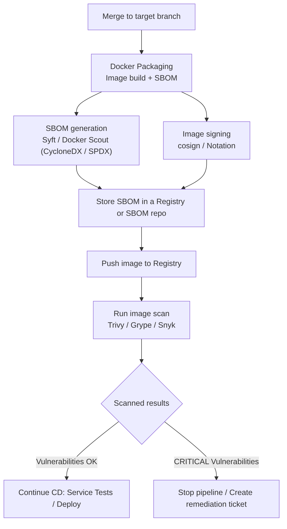 2. SBOM generation immediately after the build (tools: Syft, Docker ScoutCycloneDX/SPDX). The SBOM must reflect layers, system packages, language dependencies, and included artifacts.