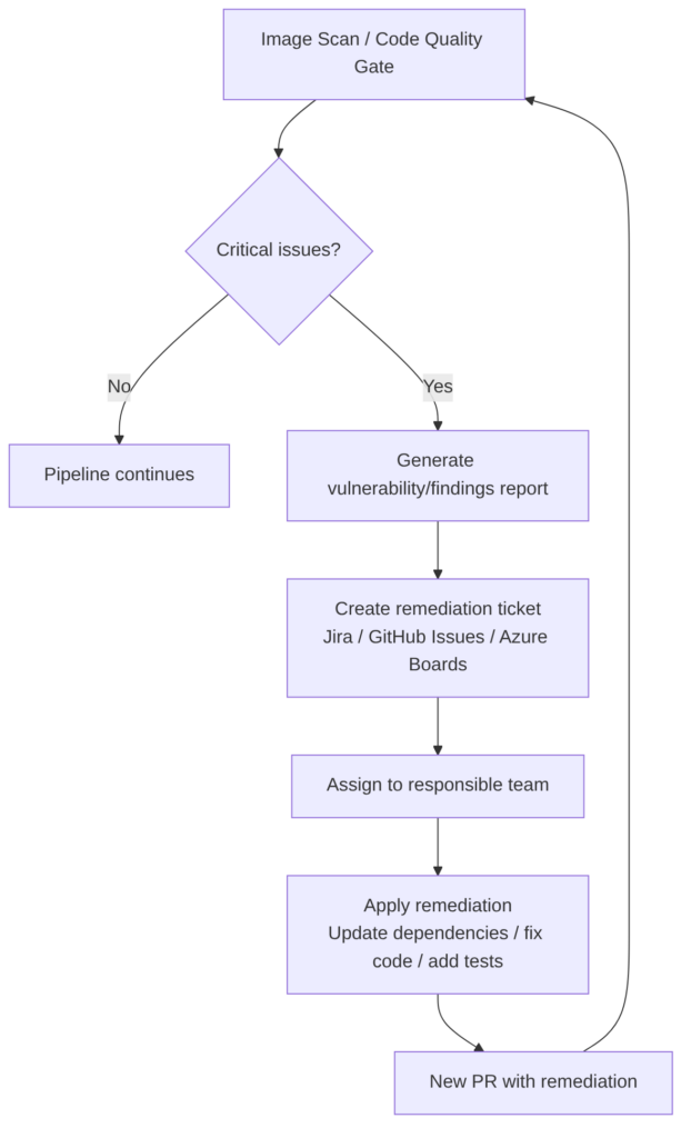 When the pipeline detects a problem that cannot be fixed automatically or that should not block the flow, it is recommended to automatically create a ticket in Jira, GitHub Issues, ServiceNow, etc. That ticket typically includes: