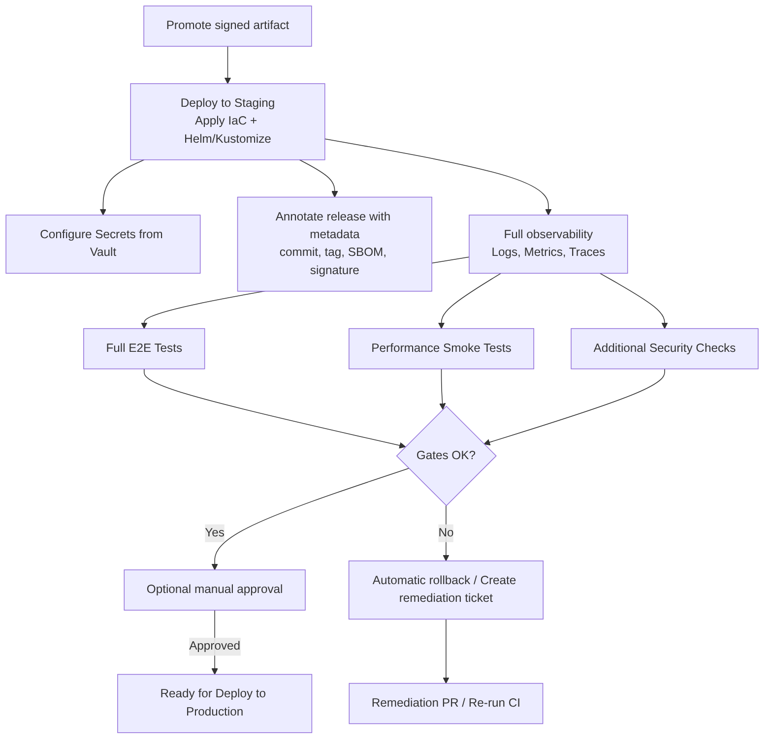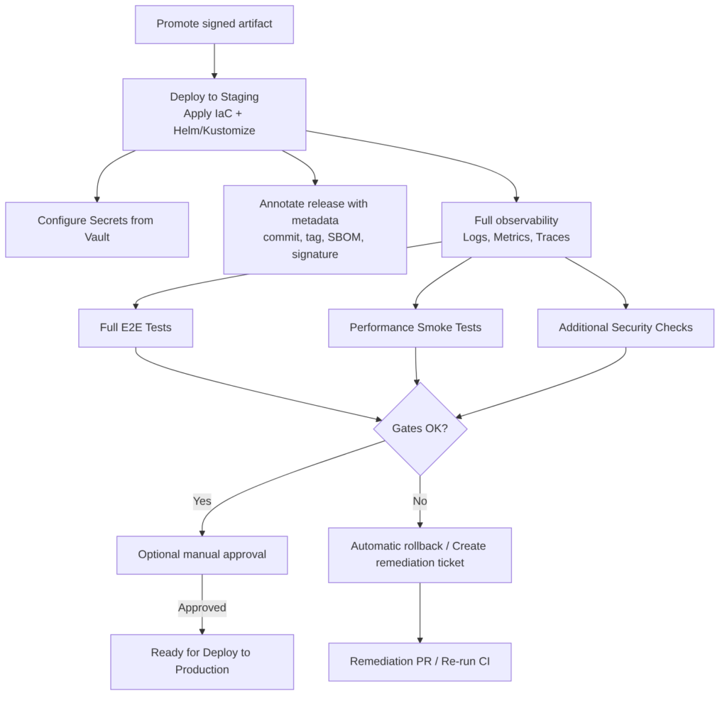 Promotes the already-verified artifact (same signed image and SBOM) to a pre-production environment that replicates the production configuration with greater fidelity. Staging is the last environment for validating integrations, performance at reduced scale, regression tests, and compliance validations before deploying to production.
