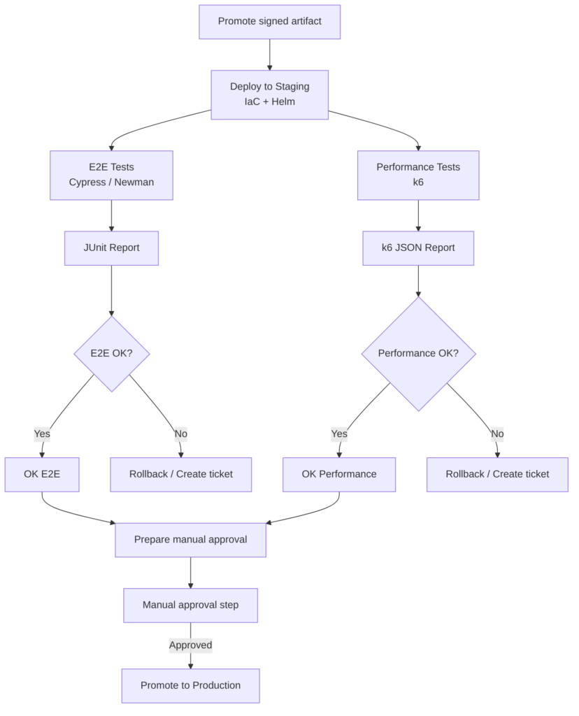 • Evaluates automatic gates: E2E failures or performance thresholds (e.g. p95 > X ms, error rate > Y%) block promotion.