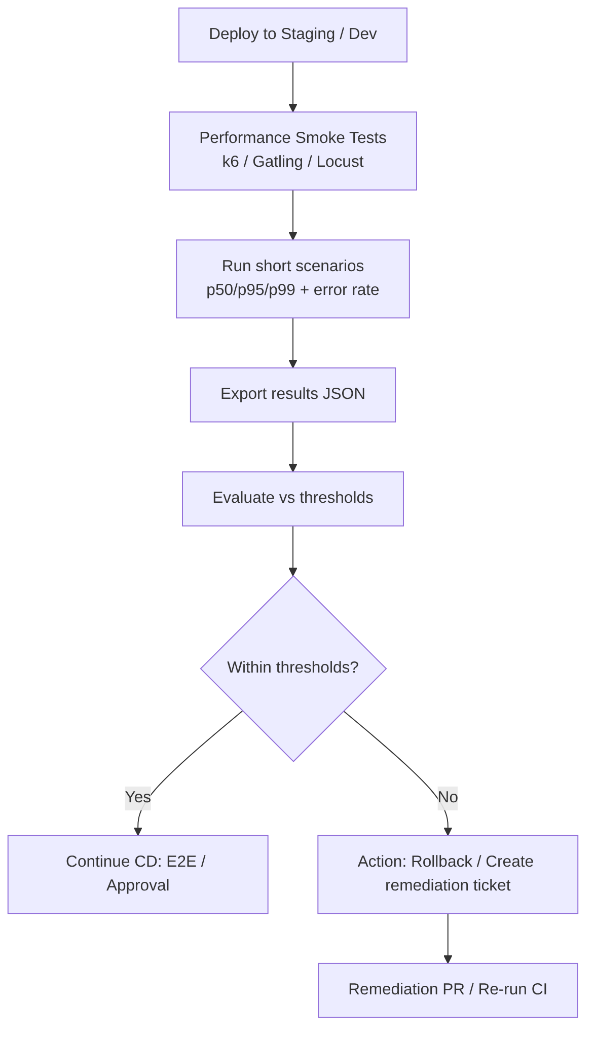 Runs lightweight and deterministic performance tests after a deployment to validate that critical endpoints meet basic latency and stability requirements before advancing to full load tests or production. They aim to detect obvious degradations (p95/p99, error rate) that would indicate the deployment is not fit for promotion.