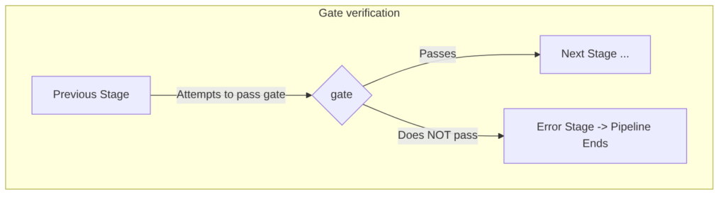 A gate is a mandatory control point within a pipeline where quality, security, or compliance criteria are evaluated before allowing the flow to continue.