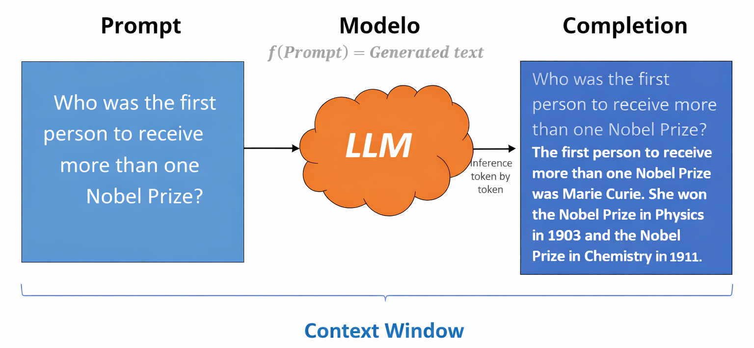 After receiving the prompt, Inference begins: the model generates output sequentially (token by token), progressively building coherent text until it completes the answer or reaches the set limit. The generated text is called the Completion (Prompt + Generated text).
