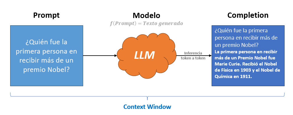 Tras recibir el prompt, comienza la Inferencia, que es el proceso en el que el modelo genera de manera secuencial (token a token) los tokens de salida, construyendo progresivamente un texto coherente hasta completar la respuesta o alcanzar el límite establecido. El texto generado se denomina Completion (Prompt + Texto generado).