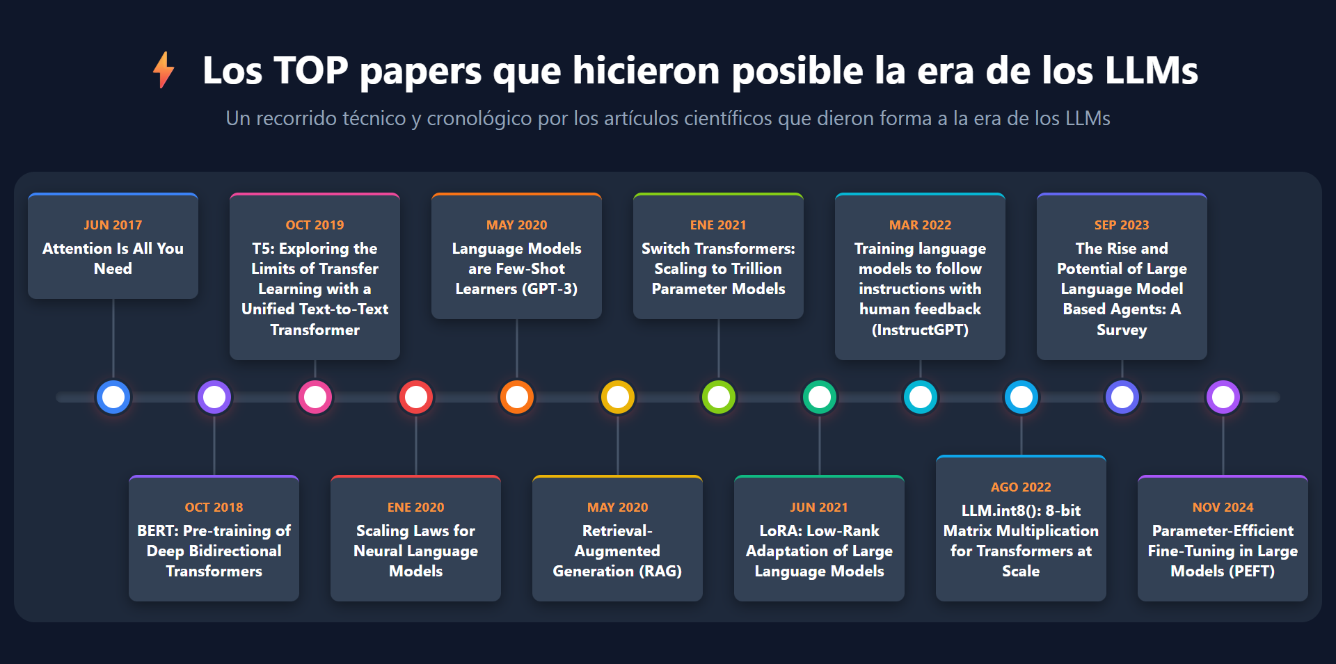 En este artículo presentaré (según mi opinión y conocimiento) los artículos científicos clave que han impulsado cada etapa de desarrollo, mostrando cómo la investigación ha sido el motor que ha llevado a los LLMs a su expansión actual.